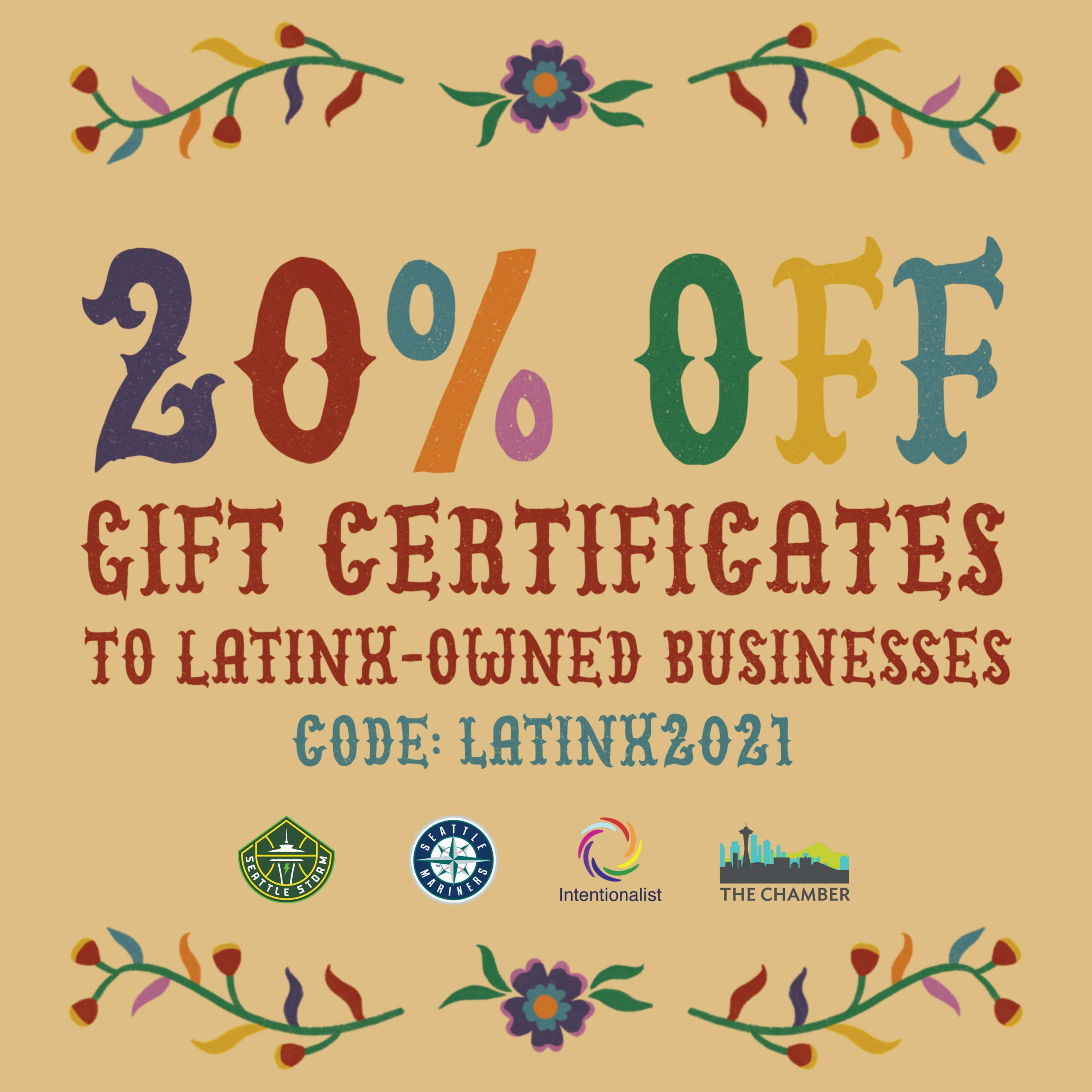 In partnership with Seattle Storm, Seattle Sounders FC, OL Reign, Seattle Seahawks, Seattle Mariners, and Seattle Kraken, Intentionalist is offering a Latinx Heritage Month discount of 20% off on Gift Certificates to Latinx-owned businesses in our Gift Certificate Marketplace.